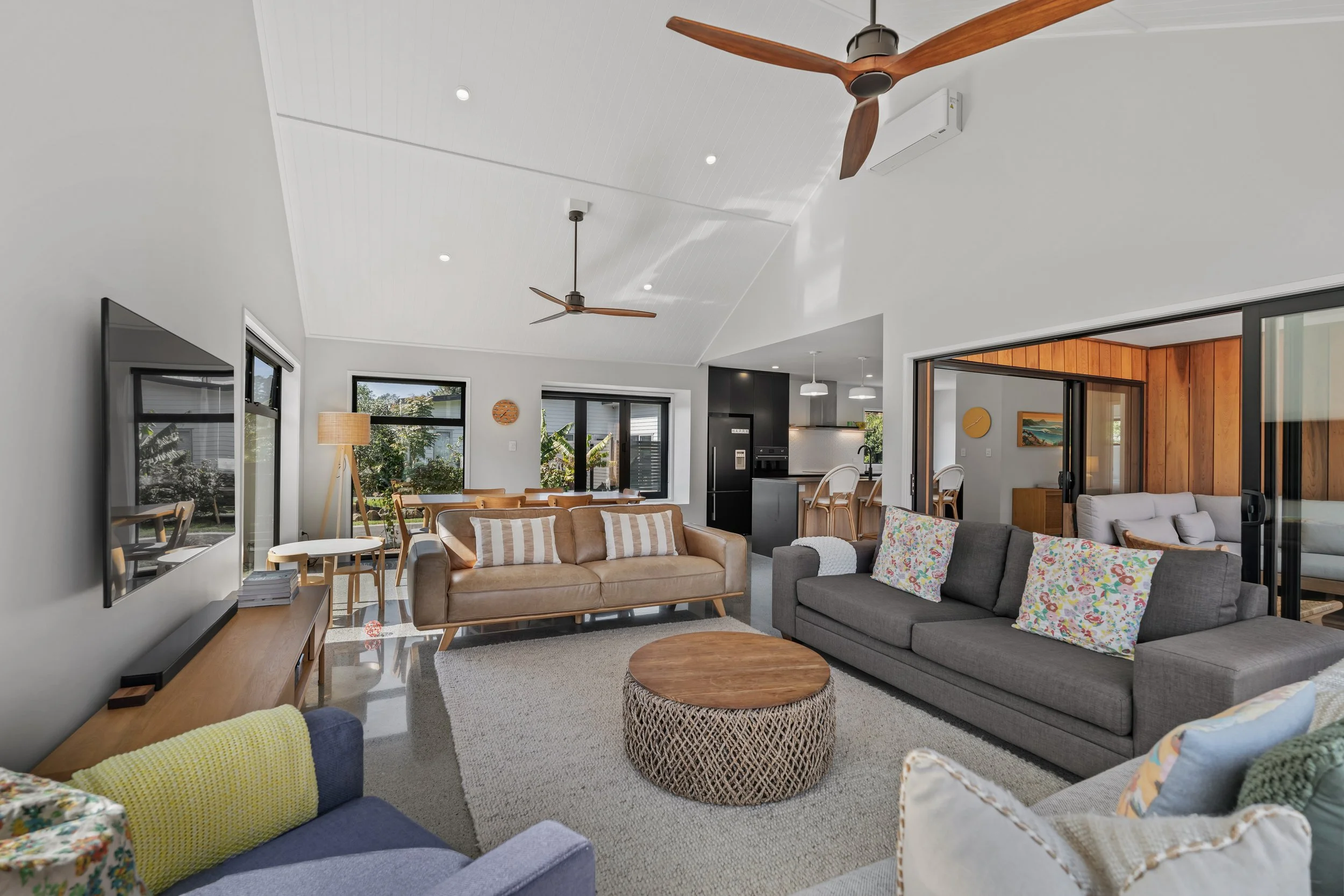 Perfect for families or groups, the house sleeps up to eight guests across four comfortable bedrooms. At the heart of the home, the open-plan kitchen, dining, and living area flow effortlessly onto the central deck. A fully equipped kitchen, Smart TV, and inviting lounge make staying in just as enjoyable as going out. Step outside to enjoy long lunches at the outdoor dining table, fire up the BBQ, or take a dip in the pool (heated on request).